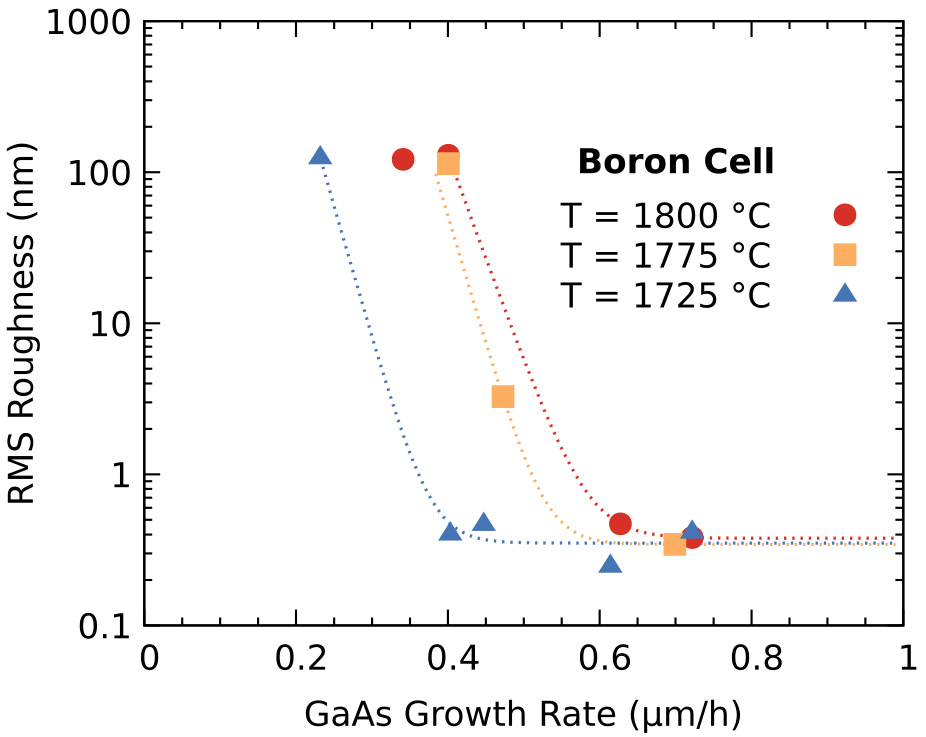 RMS roughness of BGaAs layers grown at different GaAs growth rates and B cell temperatures.