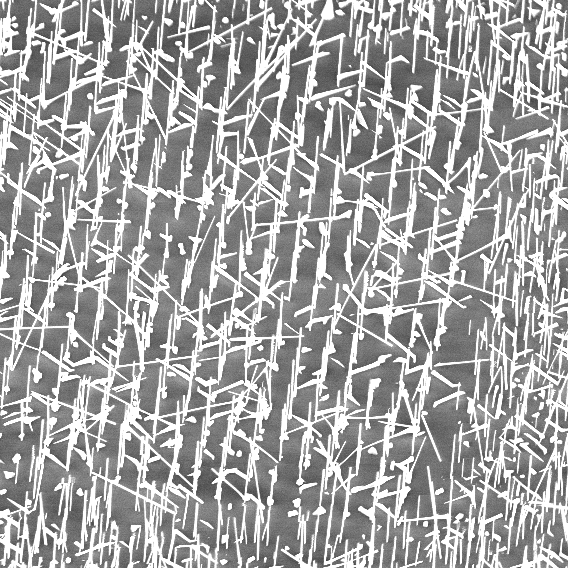 GaAs nanowire array on Si (111). The pattern was defined through FIB implantation. The nanowires were grown by molecular beam epitaxy.