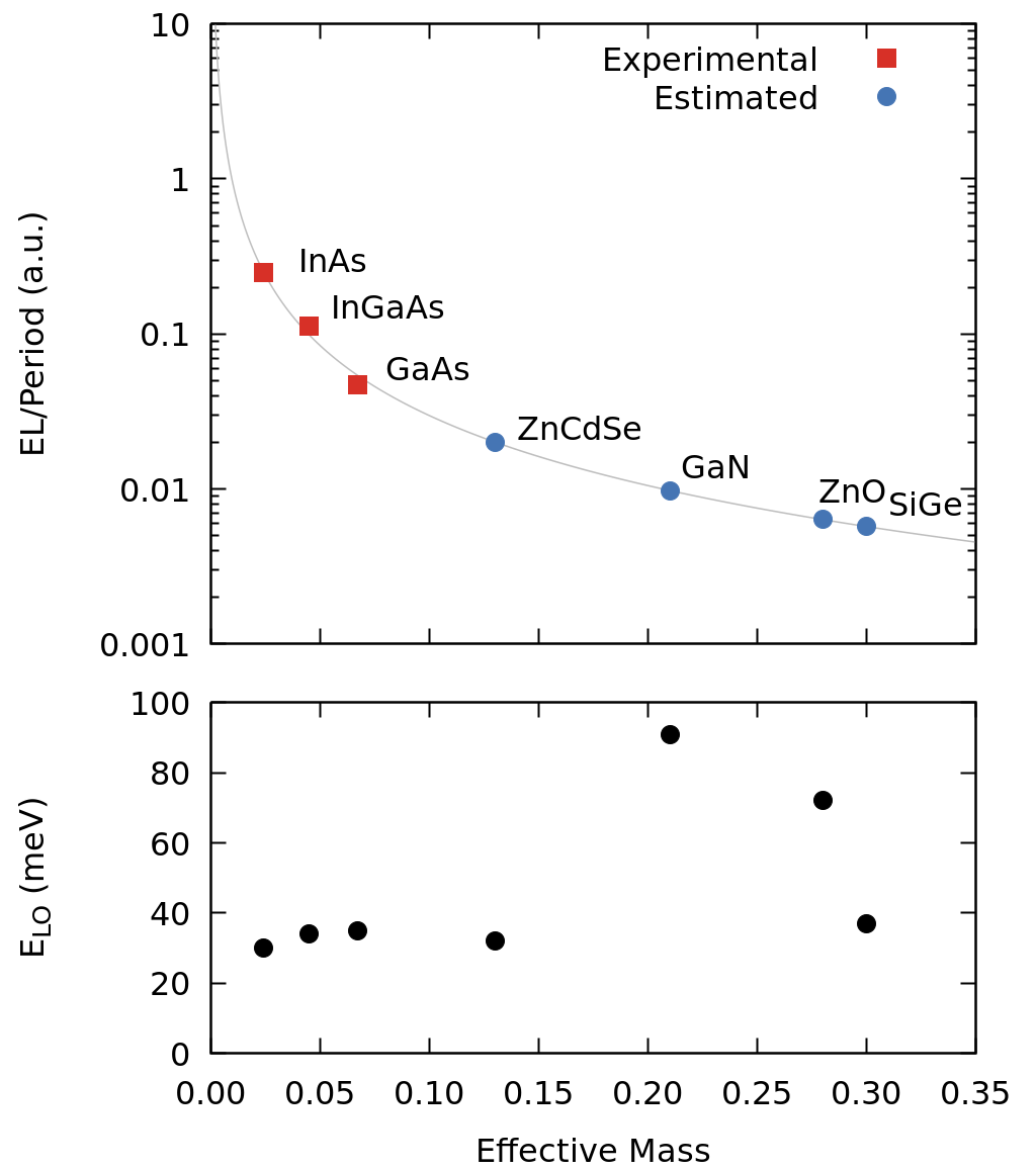 Experimental and extrapolated electroluminescence amplitude / active period for different material systems.