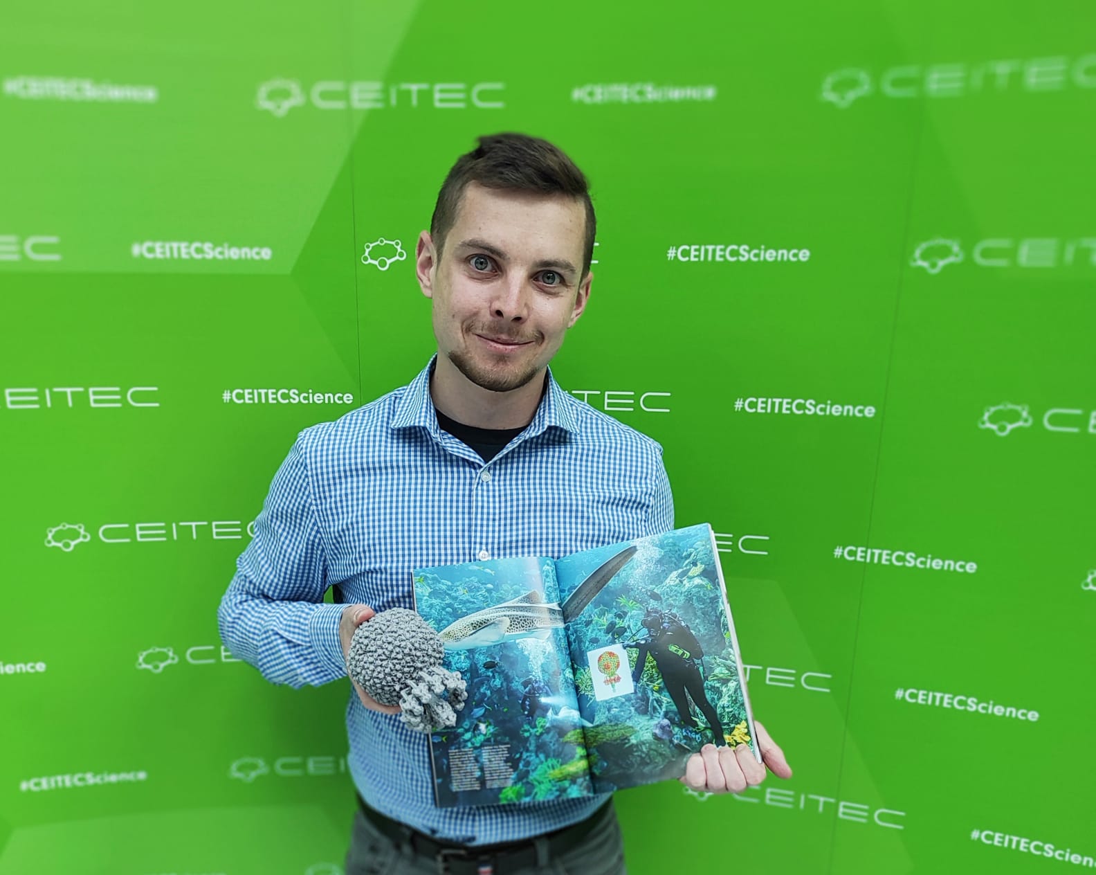 Viruses also live in oceans, and as National Geographic explains, there are more viral particles in the oceans than stars observable in the universe. “As a zebra shark cruises by, a diver at the Aquarium of the Pacific in Long Beach, California, displays an image of a bacteriophage, a type of virus that infects bacteria. Harmless to plants and animals, bacteriophages are critical for healthy marine ecosystems. The Earth’s oceans teem with these and other viruses. The aquarium’s Tropical Reef Habitat and Soft Coral Garden hold 367,166 gallons of water, with an estimated 5.32 quadrillion viruses. If lined up side by side, those viruses would circle the Earth almost eight times,” says the description under Dominik Hrebik´s image of Phage P68 in National Geographic. “I am really happy that our phage structure made it into the National Geographic magazine and now even readers from outside of our scientific community from all over the world can find out about our research,” says the author of the phage structure, Dominik Hrebik. The editors decided to use the phage image in the ocean because bacteriophages are well known also for their ability to contribute to the stability of ocean microflora.